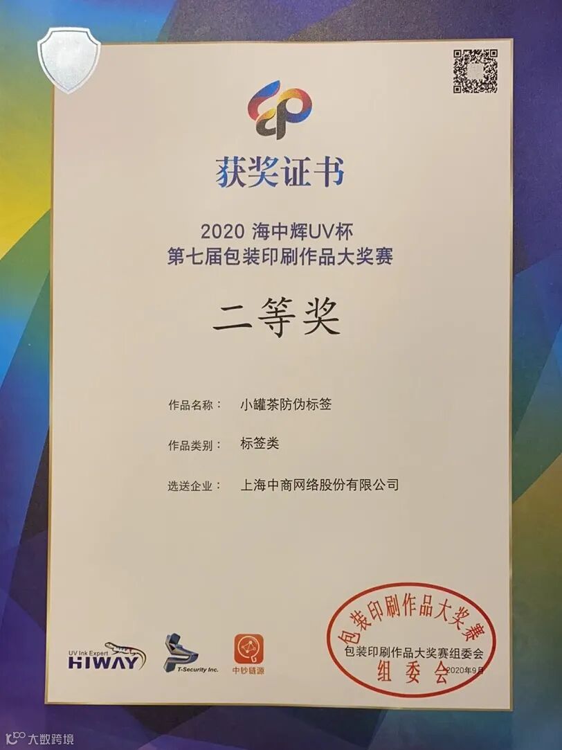 会议傍晚,2020“海中辉UV杯”第七届包装印刷作品大奖赛颁奖典礼在雄安新区塑纸协会秘书长邵岩的主持下隆重举行。本次大奖赛的举办初衷是为了更好地提高印品质量,保障批量生产品质,推广新材料、新工艺、新技术在包装印刷行业的应用,展示凹印、胶印、柔印、网印及数字印刷工艺的技术创新作品,在参赛的过程中,CCN中商凭借小罐茶防伪标签荣获了大奖赛标签类“二等奖”。