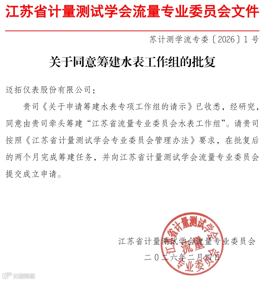 近日,经江苏省计量测试学会流量专业委员会批准,迈拓仪表股份有限公司牵头筹建 “江苏省流量专业委员会水表工作组”。