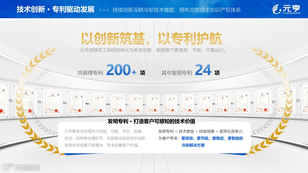 在持续研发与工程应用过程中,元亨对关键技术进行系统总结与标准化,构建起完整的自主知识产权体系。截至目前,元亨累计形成200余项专利成果,其中发明专利24项,全面覆盖结构设计、运行可靠性、节能节水、低噪声及系统优化等关键方向。同时,元亨取得美国CTI认证、中国节能与节水认证及ISO管理体系认证,使产品性能、能效与可靠性具备可对标、可验证的专业基础。