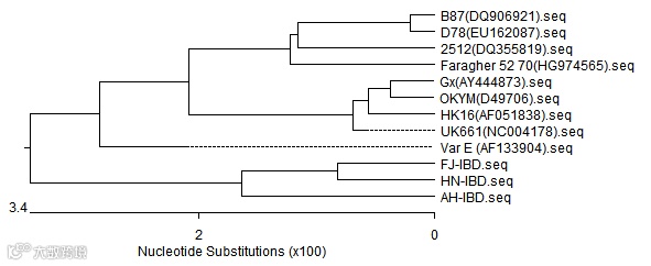 VP2序列分析 针对VP2序列进行分子生物学分析,针对VP2核苷酸序列的进化树显示分离株(HN、AH、FJ)与国外变异株(Var E)以及超强毒和中等强毒处于不同的分支。 |