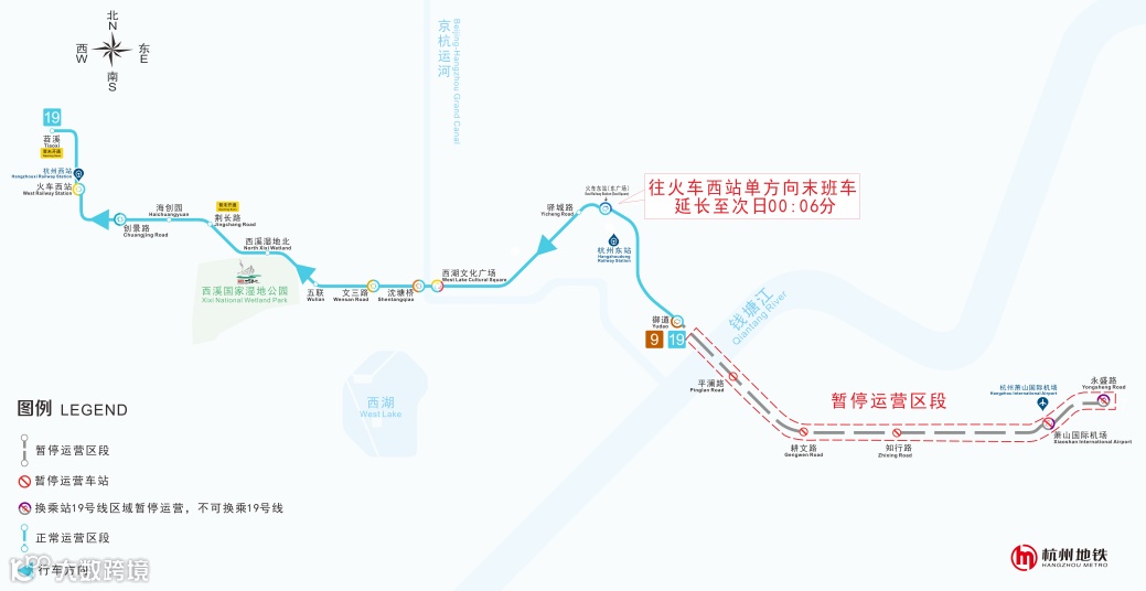 ◎19号线:正常运营区段中,火车东站前往火车西站的方向末班车由23:36延长至次日00:06,加开5列次,列车间隔9分钟,沿途各站正常停站。