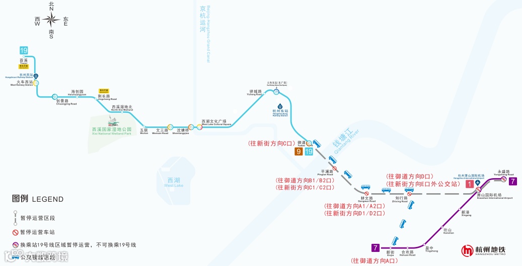 原乘坐19号线前往萧山国际机场方向的乘客,可在御道站换乘临时接驳线,可沿途到达平澜路站、耕文路站、知行路站,并在新街站换乘7号线抵达机场;原在萧山国际机场、永盛路站乘坐19号线往火车西站方向的乘客,可乘坐7号线至新街站换乘临时接驳线,可沿途到达知行路站、耕文路站、平澜路站,或至御道站换乘19号线。