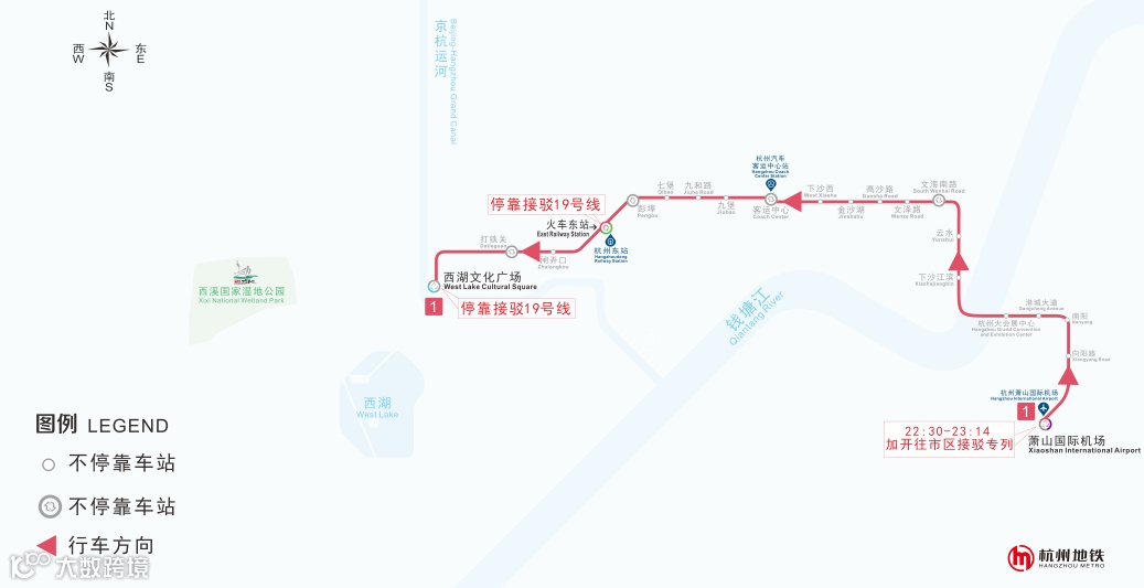 ◎1号线:萧山国际机场往湘湖方向末班车发出后,自22:30起至23:14止加开5列次由萧山国际机场站前往市区方向接驳列车,列车间隔9分钟,接驳列车仅停靠火车东站和西湖文化广场站,其他站点不停站;