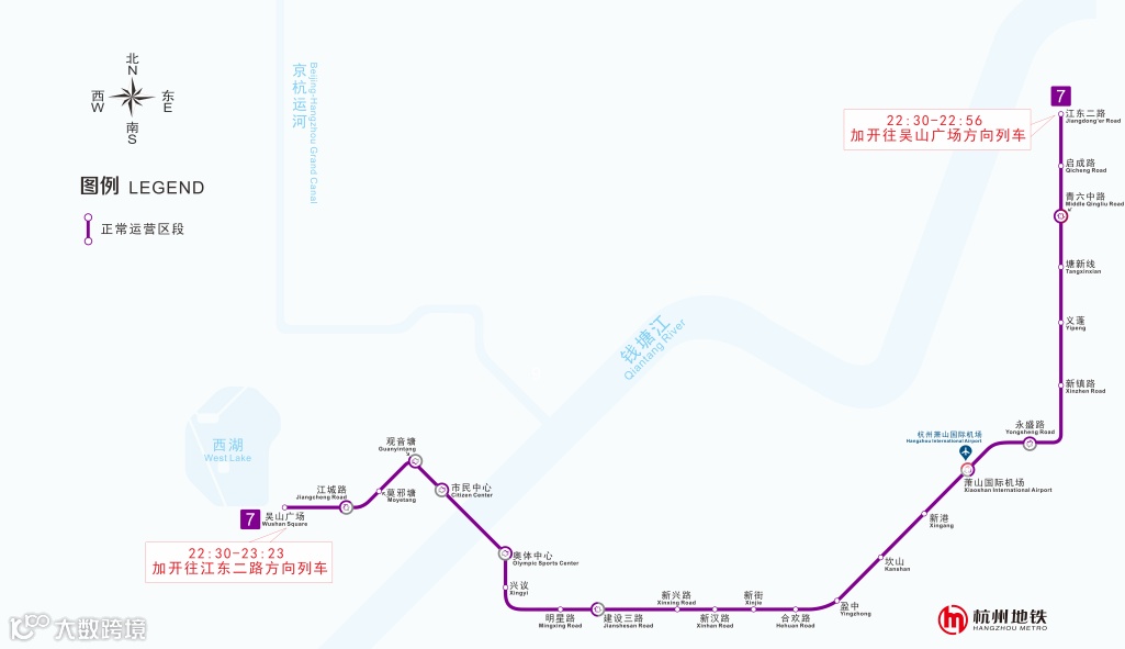 ◎7号线:由江东二路站前往吴山广场站方向的末班车延长至22:56;由吴山广场站前往江东二路站方向的末班车延长至23:23,列车间隔9分钟,沿途各站正常停站;
