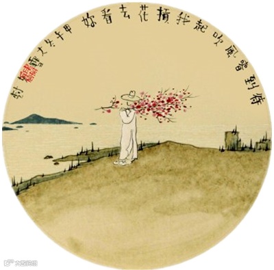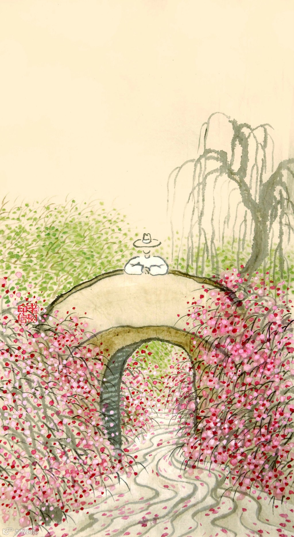 “待到春风吹起,我扛花去看你。说尽千般不是,有意总在心里。”2014年12月里寒冷的一天,“老树”刘树勇像往常一样把一幅小画配上写的几行小诗贴在微博上,然后去自己的工作室里忙活。画中有他最常用的元素:寥寥数笔勾勒出的一个穿着长衫的男人,意态闲适。在山水之间扛着一枝足有他身量大小的树枝,上面嫣红点点,繁花正好。诗是他一贯的风格,明白如话,介于雅俗之间,没有凸显身份的“我”和泛指的“你”,无意中把所有人变成了倾诉者与倾诉的对象。