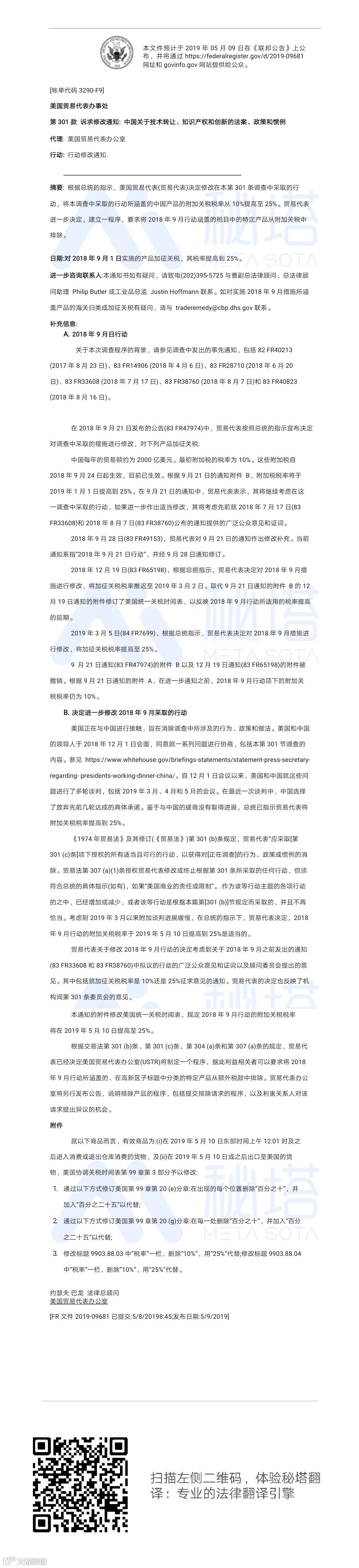 附:秘塔翻译对文件Federal Register 2019-09681的参考机器翻译