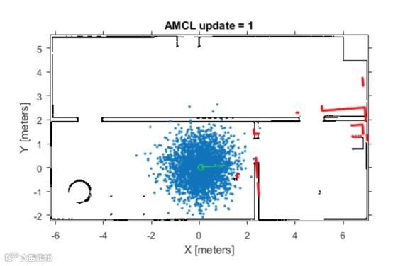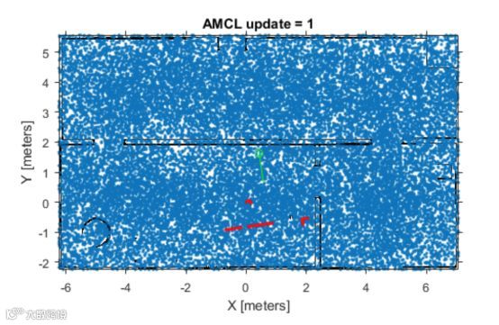 机器人的自我定位,和人的自我定位是很相似的。假设一个人去逛一个陌生的公园,刚走进去时是不知道自己在哪里的。走着走着,发现一个公园地图。此时要搞清楚自己在哪里,就是先观察周围的特征,有什么墙,有什么道路,有什么湖之类的,然后在地图上面去进行匹配,得出一个位置和朝向。这个过程是一个反复试错的过程,第一次不一定就对了,有时候同行的小伙伴也可能有完全不同的看法, 这个时候可以先不着急决定,保留几种可能性,再走走看。一般再多走几步路,看到前面一个更为明显的特征,就能决定正确的位置了。 机器人的定位算法也是这样。最常用的算法叫Monte Carlo Localization。 大概就是随时维护一个可能的位置向量集合,通过机器人对周围环境的扫描与地图进行比对,不断地更新位置向量集合中每一个向量的概率。机器人走动得越多,这个概率越确定。一开始算法会随机分配一些位置向量,如下图中的每一个蓝色点: