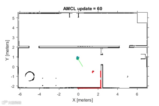 此时机器人能够确定自己大概的位置范围了。如果机器人继续在地图范围内活动,会继续排除掉不可能的位置向量,运气好的话最终可以得到一个较为精准的估计: