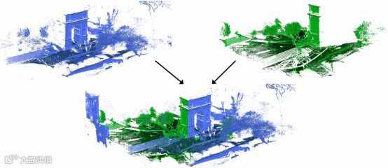 有了两个点云之间的Transform之后,就可以将点云B中的点,通过坐标系变换投影到点云A的坐标系中,从而实现两个点云的融合,如下图: