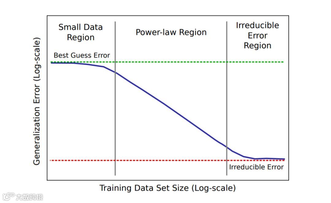 百度的研究人员在2017年的Deep Learning Scaling is Predictable, Empirically 研究中,通过对一系列的模型实验(包括翻译,语言模型,语音识别和图像识别),发现随着训练数据量的变化,其错误率下降符合以下经验公式: