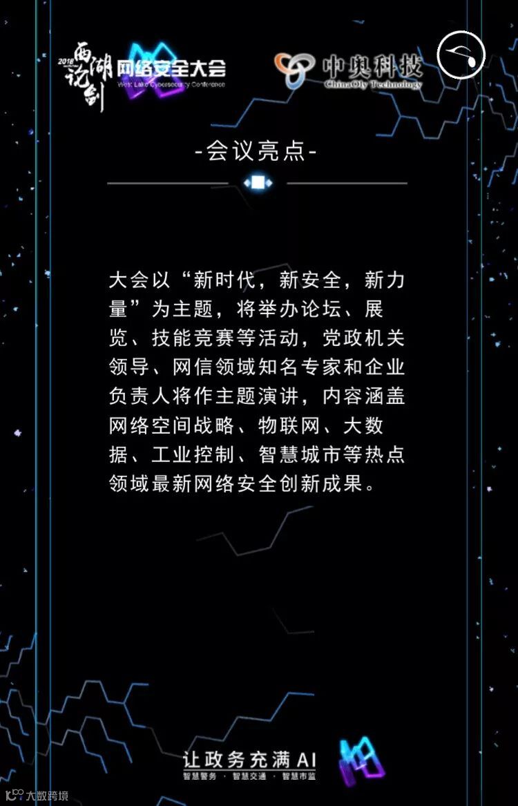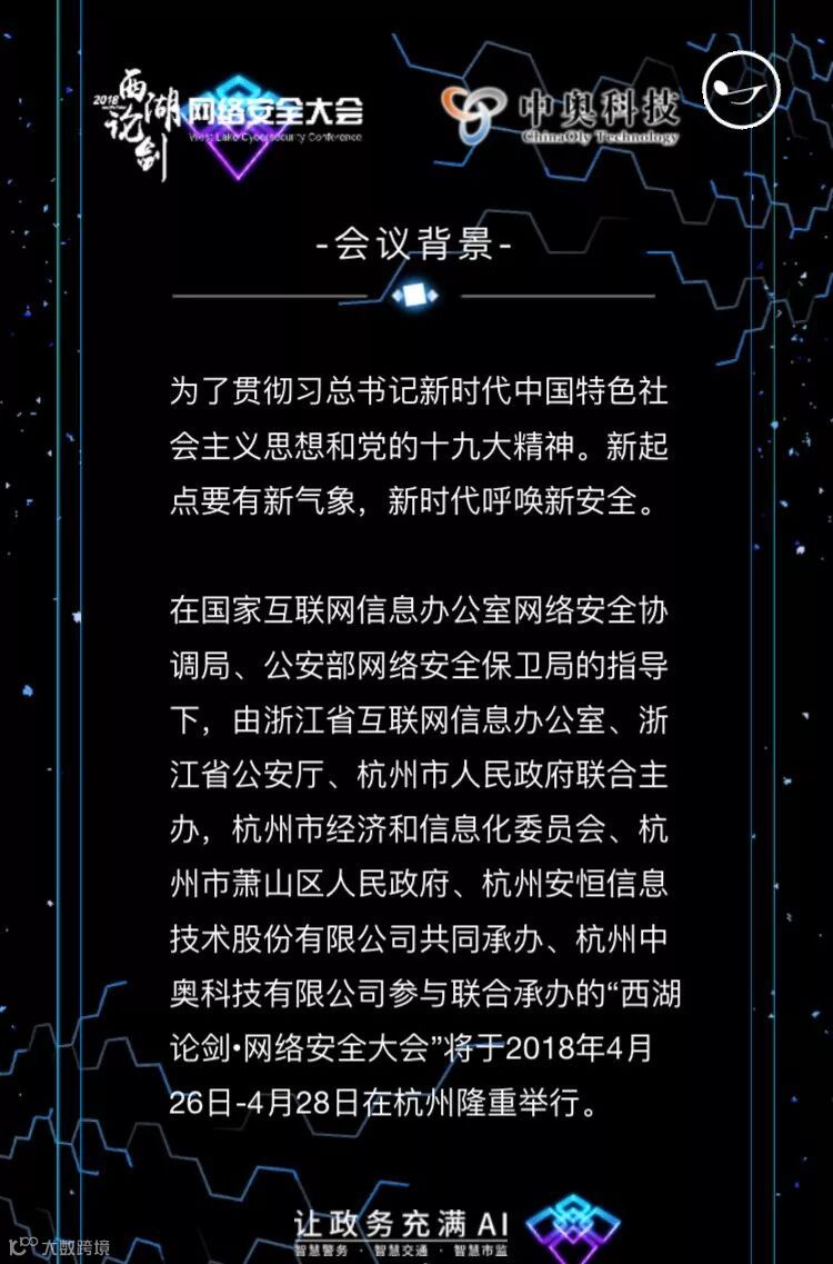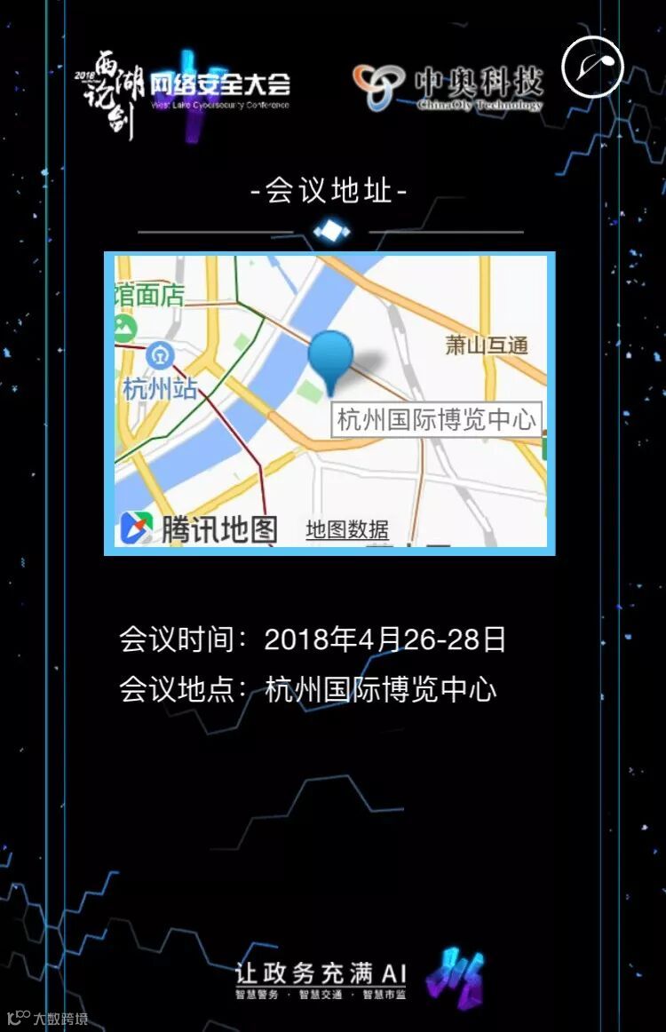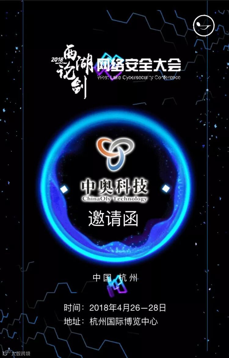 由浙江省互联网信息办公室、浙江省公安厅、杭州市人民政府联合主办,杭州市经济和信息化委员会、杭州市萧山区人民政府、杭州安恒信息技术股份有限公司共同承办、杭州中奥科技有限公司参与联合承办的“西湖论剑•网络安全大会”将于2018年4月26日-4月28日在杭州国际博览中心隆重举行。