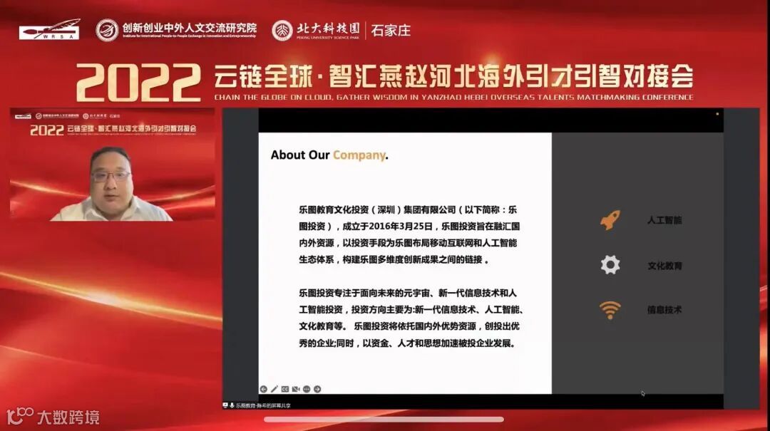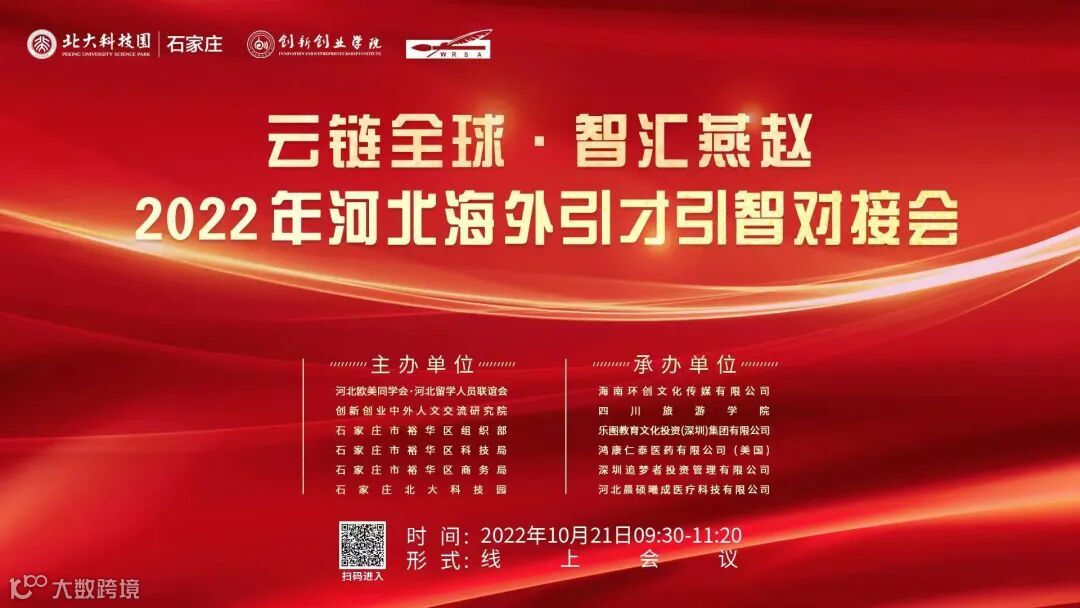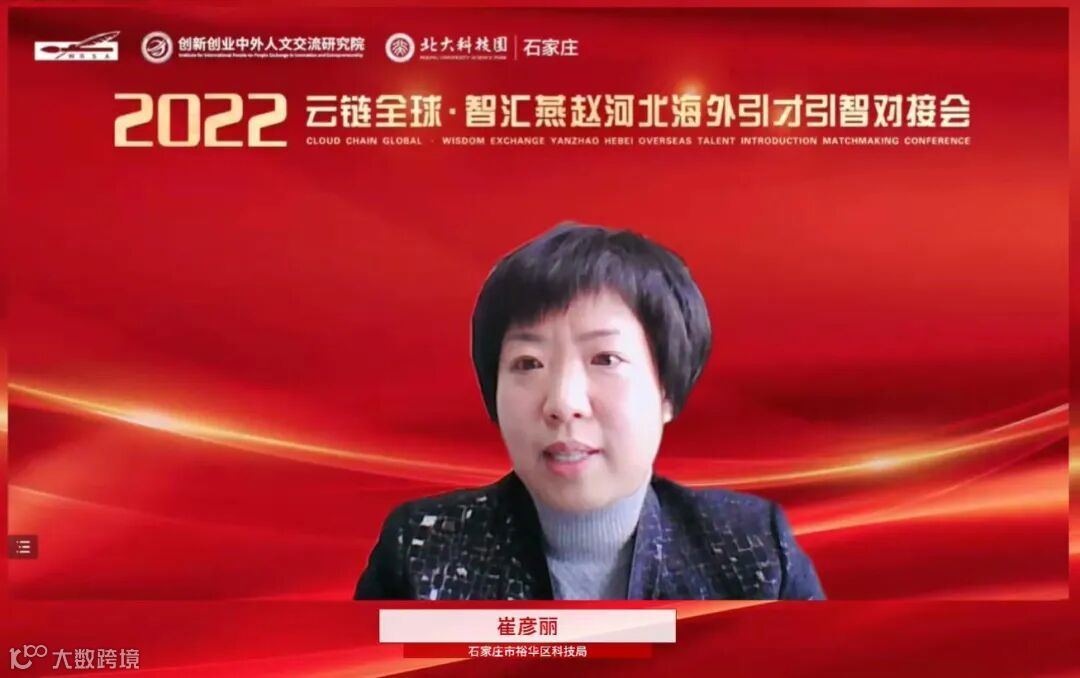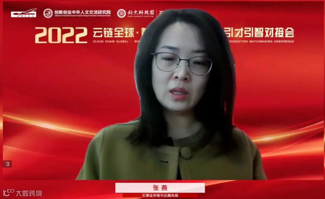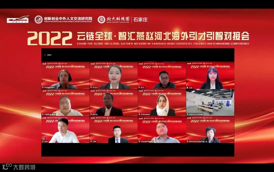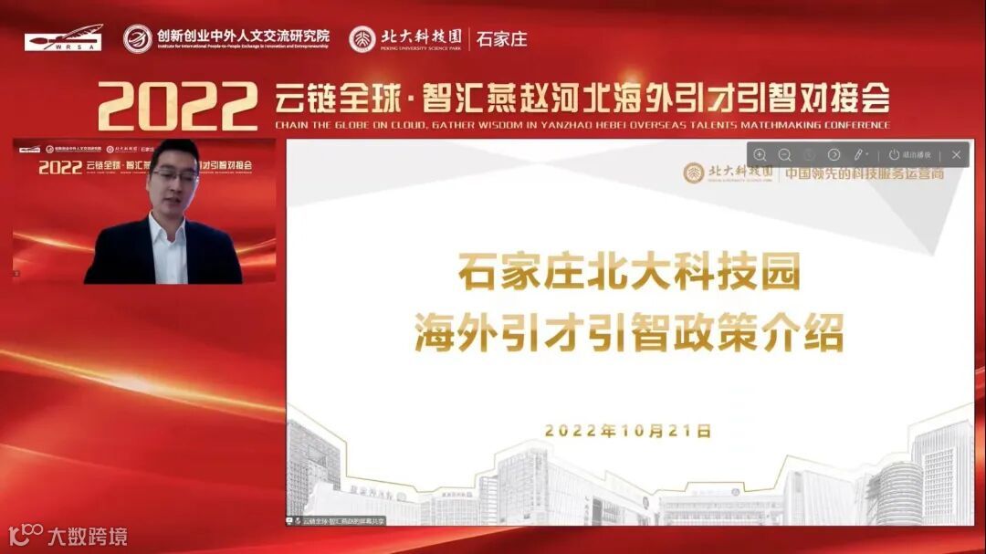 2022年10月21日,由河北欧美同学会·河北留学人员联谊会、创新创业中外人文交流研究院、裕华区委组织部、裕华区科技局、裕华区商务局、石家庄北大科技园共同举办的“云链全球·智汇燕赵”2022年河北海外引才引智对接会在石家庄北大科技园成功举行,活动以“线上”办会的形式开展,来自美国、法国、阿根廷、尼日利亚、巴基斯坦等国家的专家和项目负责人线上参会,此次直播共计2.1万人次观看。石家庄北大科技园海外创新中心与海外项目投资中心首次亮相,标志着石家庄北大科技园布局海外、国际化发展正式落地。