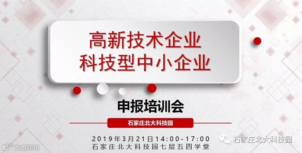 为帮助企业更加清楚的了解河北省科技项目申报、科小技型中小企业、高新企业申报等各方面的相关知识,石家庄北大科技园将于3月21日举行高新技术企业、科技型中小企业申报培训会。现将有关事项通知如下: