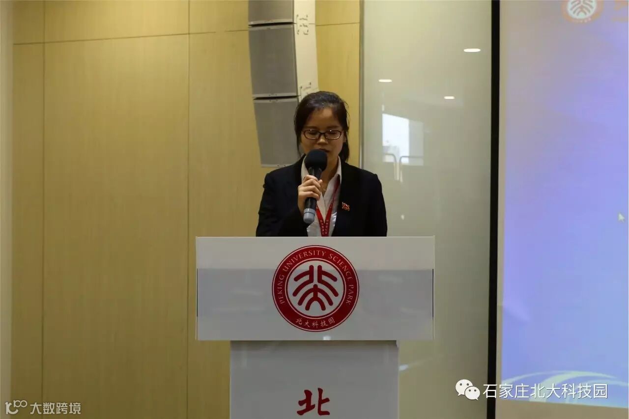 石家庄北大科技园党支部书记田品在揭牌仪式上的做表态发言,她表示石家庄北大科技园成立党组织,一方面,从制度上、根本上使石家庄北大科技园能够作为党的基层组织,开展党的活动,为党的事业贡献一份力量;另一方面,通过党组织的正确引导、党员的身体力行,激励带动全体员工形成“比、学、赶、帮、超”的工作学习氛围,更好推动众创事业的蓬勃发展。