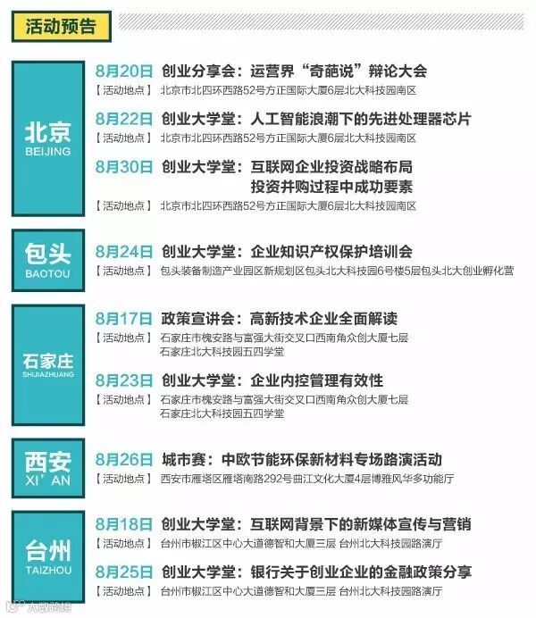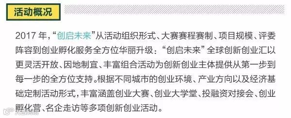 “创启未来”2017全球创新创业汇全面启动,活动将遍及北京、包头、金华、天津、石家庄、西安、台州、郑州、香港、首尔、西雅图、波士顿、硅谷等地。作为创新创业汇的核心活动,“创启未来”2017国际青年科技创业大赛正面向全球征集优秀创业项目。更多信息及报名详情请关注活动官方网站: