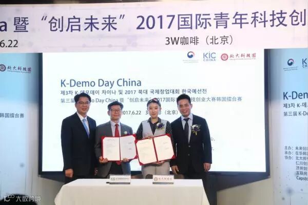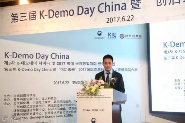 6月22日下午,北大科技园携手韩国未来创造科学部、在华韩国创新中心共同举办的第三届K-Demo Day China暨“创启未来”2017国际青年科技创业大赛韩国擂台赛在创业大街3W咖啡厅圆满落幕。韩国未来创造科学部参赞李承源、在华韩国创新中心主任高永和、北大科技园副总裁王国成等主办方代表出席活动并致辞,来自中韩两国的创投机构、评委导师、知名媒体和21个在华创业韩国参赛企业等近百人共享中韩创新创业交流盛事。