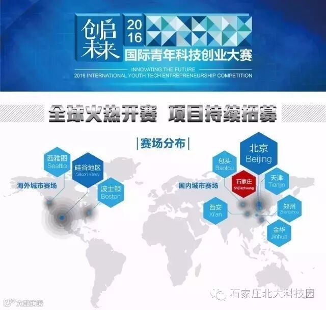 石家庄北大科技园积极对接创客项目,为创客提供全面的创新创业服务与支持,重磅推出“创启未来”2016国际青年科技创业大赛石家庄城市赛。城市赛自2016年7月16日启动以来,得到创业者、创业项目的积极响应,报名参赛进入项目超百余个。经大赛组委会评审导师线上线下层层筛选,成功晋级的选手将参加于2016年11月3日举行的“创启未来”2016国际青年科技创业大赛石家庄城市赛决赛。