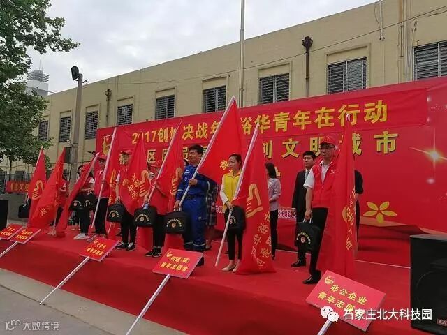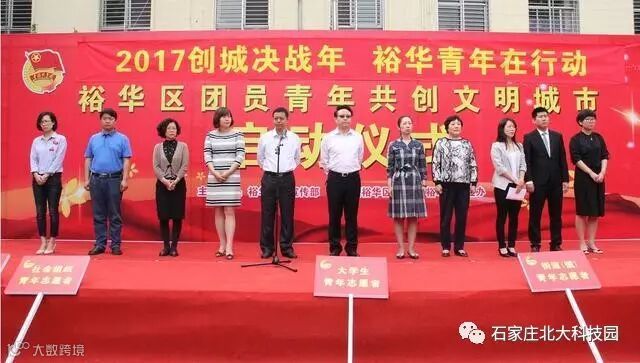 为充分发挥裕华区广大青年、团员志愿者在创建全国文明城市工作中的生力军作用,打好创城攻坚战,5月3日上午,裕华共青团裕华区委联合区委宣传部、裕华区创建办在裕华区青园小区社区广场举办“创城决战年 青年在行动”裕华区团员青年共创全国文明城市启动仪式。石家庄北大科技园等200余裕华青年志愿者参加了本次启动仪式。