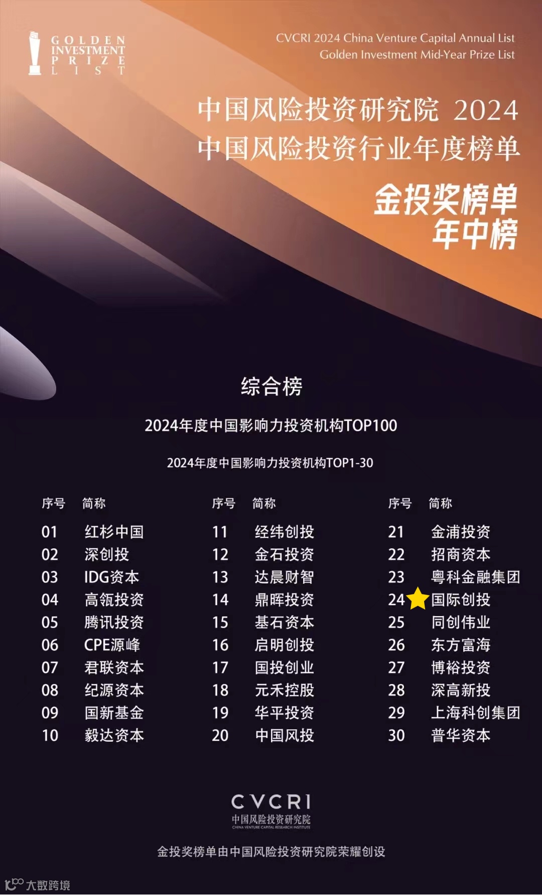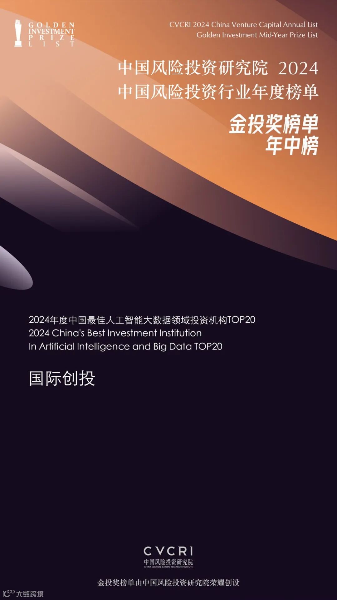 国际创投首次荣登“中国最佳数字经济领域投资机构TOP20”榜单,并蝉联“中国最佳人工智能大数据领域投资机构TOP20”,公司在数字经济、智能科技的持续深耕,获得业界认可;同时,荣获“中国影响力投资机构TOP30”。