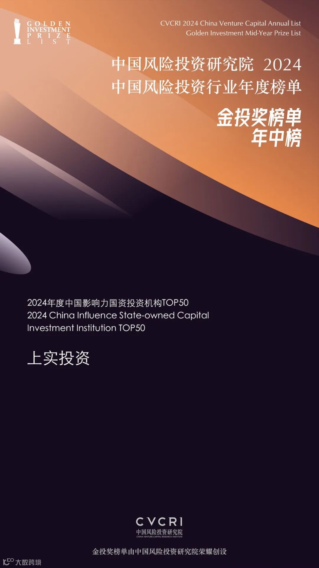 上实投资荣获“2024年度中国影响力国资投资机构TOP50”,公司始终坚持融产结合,持续贡献产业价值和经济回报。