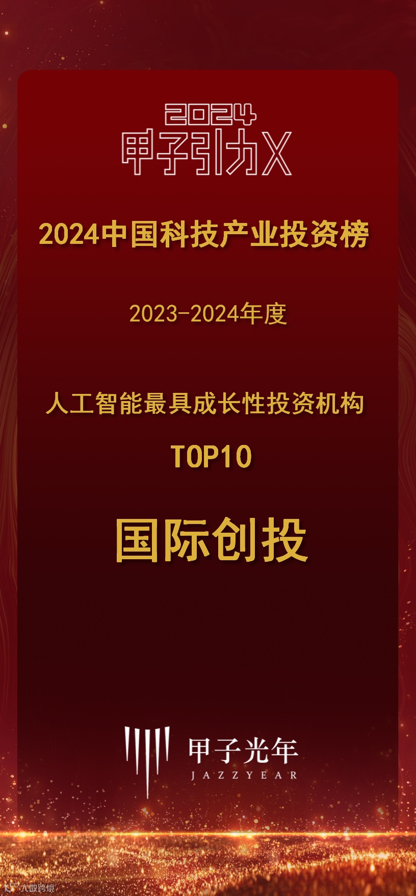 2024年8月28日,国内领先的科技产业智库「甲子光年」举办「举棋恰少年·2024甲子引力X科技产业投资大会」,同时,前期依据公平公正的评选标准,在对半导体与集成电路、人工智能、高端制造、企业服务、碳中和、新材料六大重点产业相关机构进行科学完备的数据处理分析后,评选出“2023-2024年度中国科技产业投资榜”并在此次大会发布。国际创投凭借在人工智能领域的卓越表现,荣登“2023-2024 年度人工智能最具成长性投资机构 TOP10”。获此殊荣,体现了国际创投在人工智能领域的专业投资能力和市场影响力。