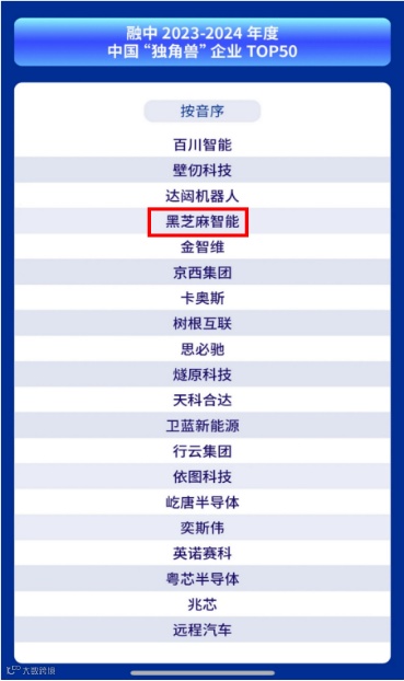 黑芝麻智能荣获融中2023-2024年度中国"独角兽"企业TOP50称号
