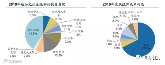 从电站系统的成本结构看出,大头在组件端。2018年地面电站光伏组件成本占比40.7%,而组件成本中67.6%为电池成本。