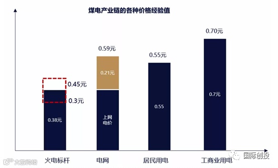 煤电上网电价,全国当前平均在0.38元,区间为0.3-0.45元;煤电上网后,电网收过网费,这个附加大约在0.21元;在售电端一般工商业户和居民户由政府定价,或者大客户参与煤电企业的竞价,当前工商业户的电价平均水平大约在0.7元,居民实行阶梯电价,最低档平均价0.55元。
