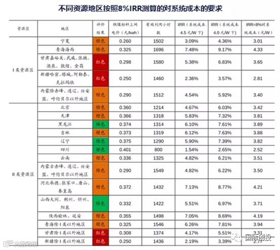 从上图可以看出,如果系统成本降低到3.8元左右,将有很多地区符合平价上网的条件。