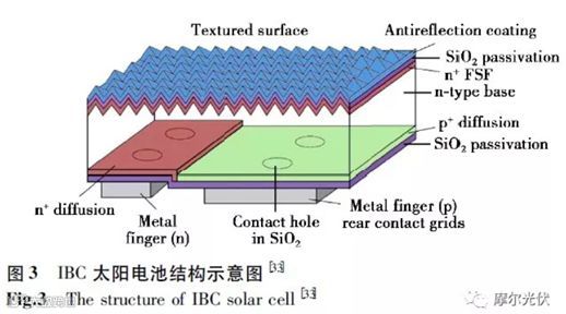 1975年,Schwartz首次提出背接触式太阳电池。经过多年的发展,人们研发出了交叉指式背接触(IBC)太阳电池,其结构示意图如图3所示。IBC太阳电池最显著的特点是PN结和金属接触都处于太阳电池的背部,前表面彻底避免了金属栅线电极的遮挡,结合前表面的金字塔绒面结构和减反层组成的陷光结构,能够最大限度地利用入射光,减少光学损失,具有更高的短路电流。同时,背部采用优化的金属栅线电极,降低了串联电阻。通常前表面采用SiNx/SiOx双层薄膜,不仅具有减反效果,而且对绒面硅表面有很好的钝化效果。这种前面无遮挡的太阳电池不仅转换效率高,而且具有外形美观等优势,适合应用于光伏建筑一体化,具有极大的商业化前景。目前IBC电池是商品化晶体硅电池中工艺最复杂、结构设计难度最大的电池,标志着晶体硅研发制造的最高水平。