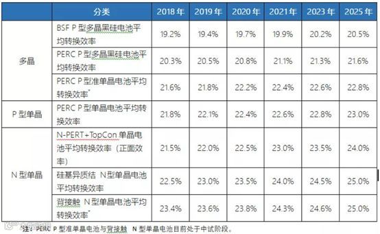 2018年,各种电池技术平均转换效率方面,规模化生产的多晶黑硅电池的平均转换效率达到19.2%,使用PERC电池技术的单晶和多晶黑硅电池效率提升至21.8%和20.3%,较2017年分别提升0.5个百分点和0.3个百分点,N型PERT单晶电池平均转换效率已经达到21.5%。双面N型PERT电池和异质结(HJT)电池已进入量产,并且会成为未来发展的主要方向之一。下表给出了2018-2025年不同类型电池转换效率变化趋势