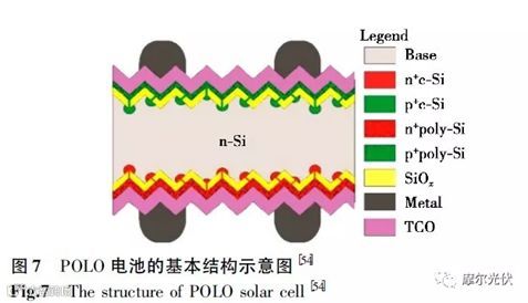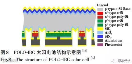 比较图7和图8可知,后者的结构结合了IBC太阳电池结构的优势,前表面无金属电极,提高了入射光的利用率;而且后者结构更复杂,前后减反层分别为AlOx/SiNy/SiOz随机金字塔状结构、AlOx/SiOz叠层结构,进一步增强了钝化与光吸收效果。其中,POLO技术的最关键点为氧化物的生长和本征多晶体硅的沉积。首先在硅片两面进行热氧化或是紫外臭氧氧化,生长氧化硅层。然后通过LPD技术沉积本征多晶硅,再运用离子注入技术,形成P、N型的多晶硅和单晶硅。