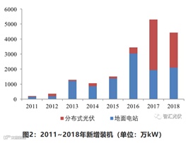 新增大幅减少,是目前光伏电站存量市场交易活跃的根本原因。根据历年的统计数据,2012~2017年之间,国内光伏装机都保持快速增速。其中,2017年新增装机达到5306万kW,是2011年的26倍!受531政策的影响,2018年新增市场突然刹车,同比减少了880万kW,如下图所示。