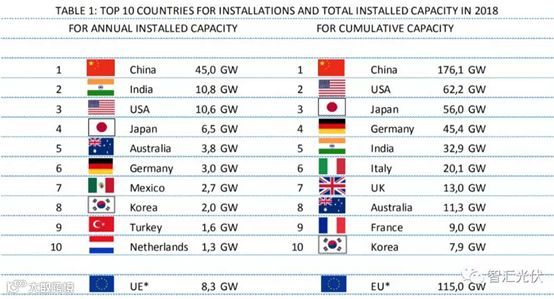 美国的光伏累计装机占到全球第二,2018年新增装机占到全球第三,如下图所示。