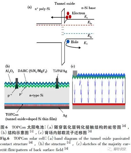 德国Fraunhofer研究中心在电池背面利用化学方法制备一层超薄氧化硅(~1.5nm),然后再沉积一层掺杂多晶硅,二者共同形成了钝化接触结构,这种技术被称为隧穿氧化层钝化接触(TOPCon)技术。由于n+多晶硅与吸收层的功函数存在差异,前者会在后者表面形成一个累积层。累积层或者能带弯曲会产生一个势垒阻挡空穴达到隧穿氧化层,而电子则能够轻易达到。相比于电子,超薄氧化层也会为空穴提供更高的势垒阻挡其隧穿,因而该层具有载流子选择性。TOPCon太阳电池的隧穿氧化层钝化接触结构的能带图和其结构示意图如图6a、b所示。