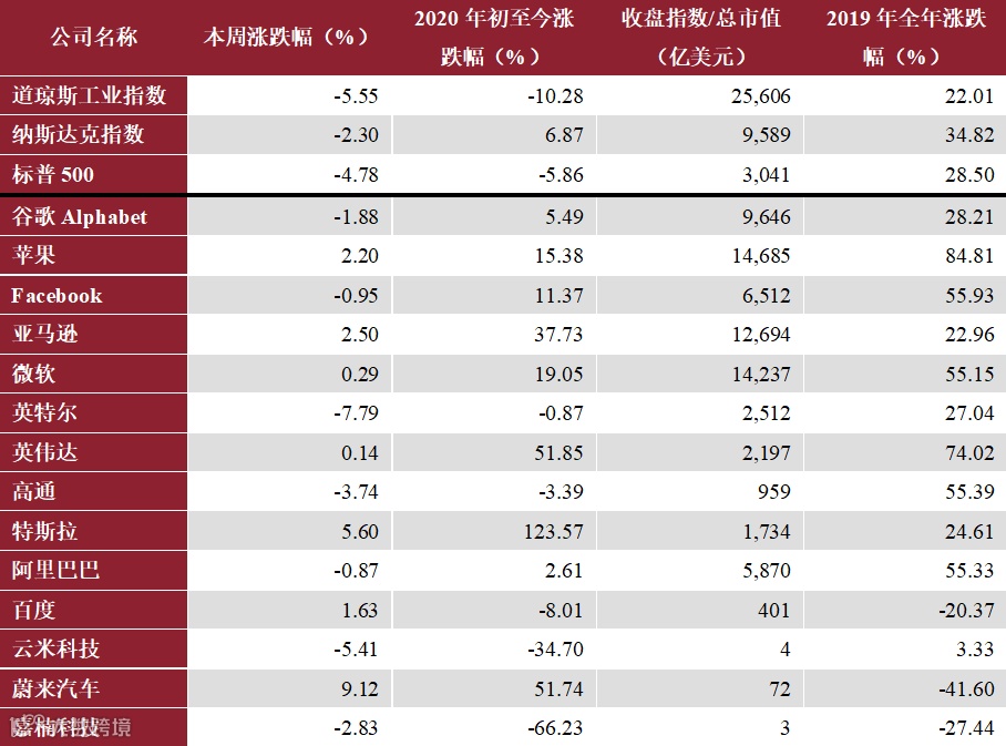 同时,我们分别追踪跨市场指数和个股行情动态,对于上市公司,暂时选择了最具代表性的14只美股及8只港股。