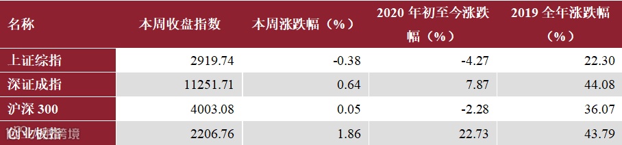 本周上证综指收跌0.38%报2919点,深证成指收涨0.64%报11251点,沪深300收涨0.05%报4003点,创业板指收涨1.86%报2206点。
