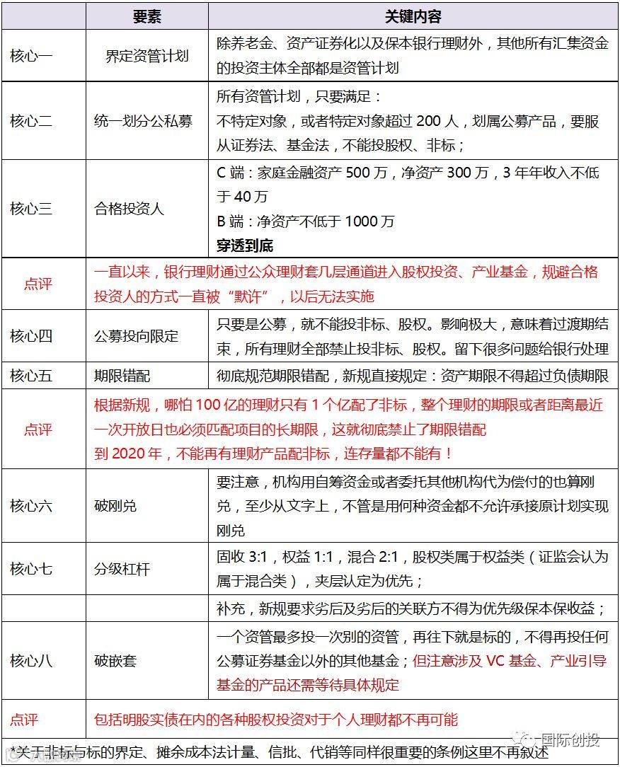 总结下,资管新规出台之日是一个划分点,只要在新规之前签署LPA,那么金融机构可以出资,可以发老产品募集资金后出资,而且过渡期过后也可继续执行,而且可以不用去穿透考虑投资人是否合格。只要不签约新的LPA,原有的产品可以无压力持续运营至结束。