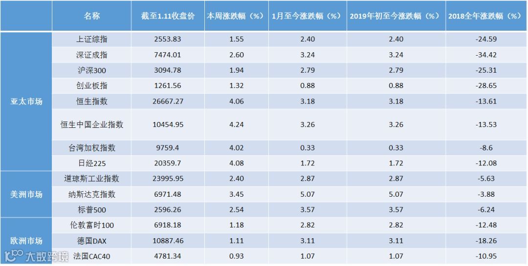 外围市场方面,一周欧美股市集体走高,但美股于本周周五收盘终结五连涨,美国政府继续关闭以及全球经济增长可能放缓重新令美股承压。美国政府关门已达到22天,超过1977年的21天,成为史上最长关门纪录。周三中美官员均宣称在北京进行的为期三天的贸易谈判取得进展,虽缺乏具体细节,但投资者普遍对新一轮贸易磋商成果持乐观态度。