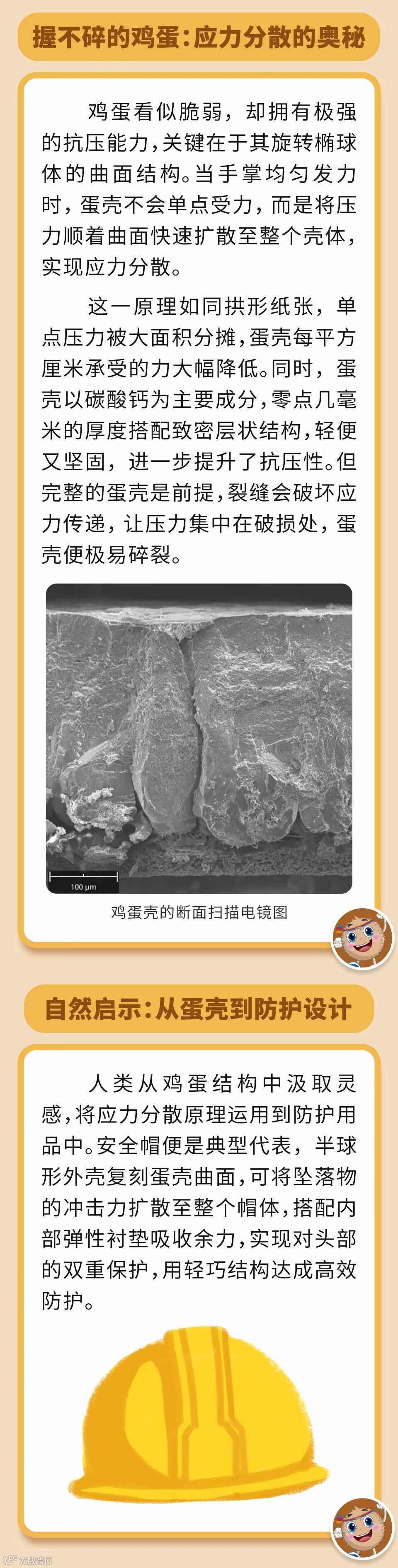 导读:我们都知道鸡蛋易碎,可把鸡蛋紧握手心全力捏压却难以使其破碎,这一奇妙现象背后,蕴藏着结构力学的核心原理,也成为人类借鉴自然、创造发明的智慧源泉。
