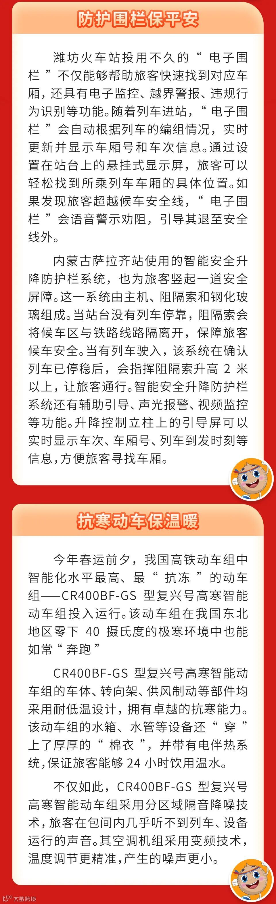 导读:2025年春运于1月14日开始,2月22日结束,为期40天。相关部门预计,今年春运期间,全社会跨区域人员流动将达到90亿人次,其中铁路客运量或突破5.1亿人次。在这场“人口大迁徙”中,少不了科技的身影