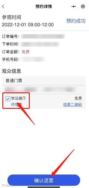 2、依次点击“预约记录-预约票详情-退票-常设展厅-确认退票”,进行退票。