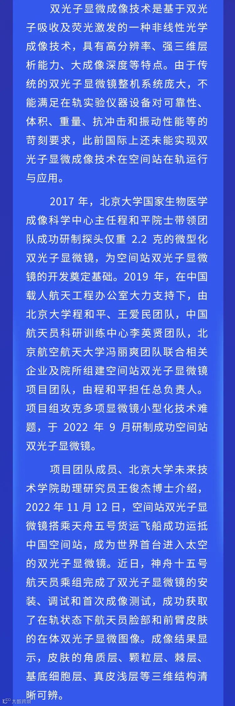 导读:世界首次!我国自主研制空间站双光子显微镜首获航天员皮肤三维图像