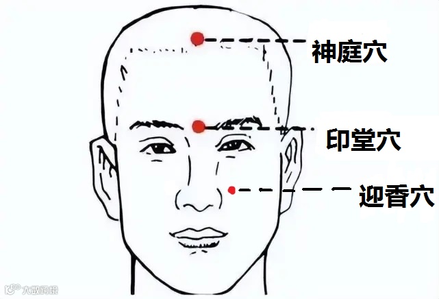 用搓热的两手中指指肚同时夹紧鼻梁,顺着鼻梁用力向上推至神庭穴(发际边沿),然后向下推至鼻翼旁。重复该动作,快速推100次左右,使鼻腔内有热感为佳。手指按揉迎香穴(鼻翼两旁凹陷处)、印堂穴(两眉正中)1分钟,以有酸胀感为佳。搓揉鼻准(俗称鼻尖子)1分钟,以鼻腔有热感为佳。