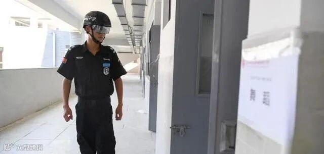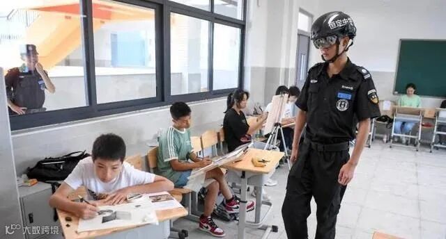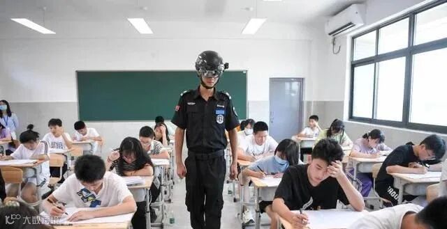 在教室中,学校的安保人员利用智能AI头盔巡视整个考场,利用无接触的方式检查每个学生的体温。