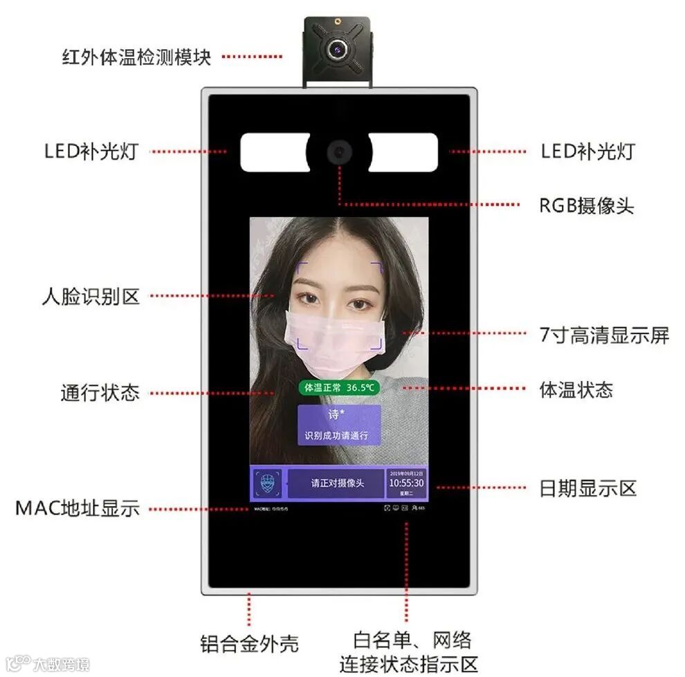 而本次解决方案中,验证进入者采用了测温型人脸识别一体机,此机型可实现非接触式测温,核验身份的同时检测体温以及是否佩戴口罩。