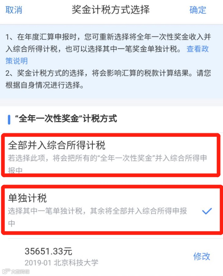 从多个单位获取多笔年终奖的人员,需要自行指定哪笔收入并入综合所得计税,保证最多只能有一笔年终奖可以享受单独计税。