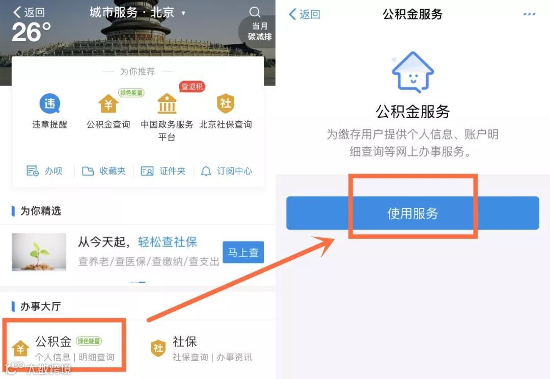 点击左上角“公积金查询”,进入页面后点击“使用服务”。
