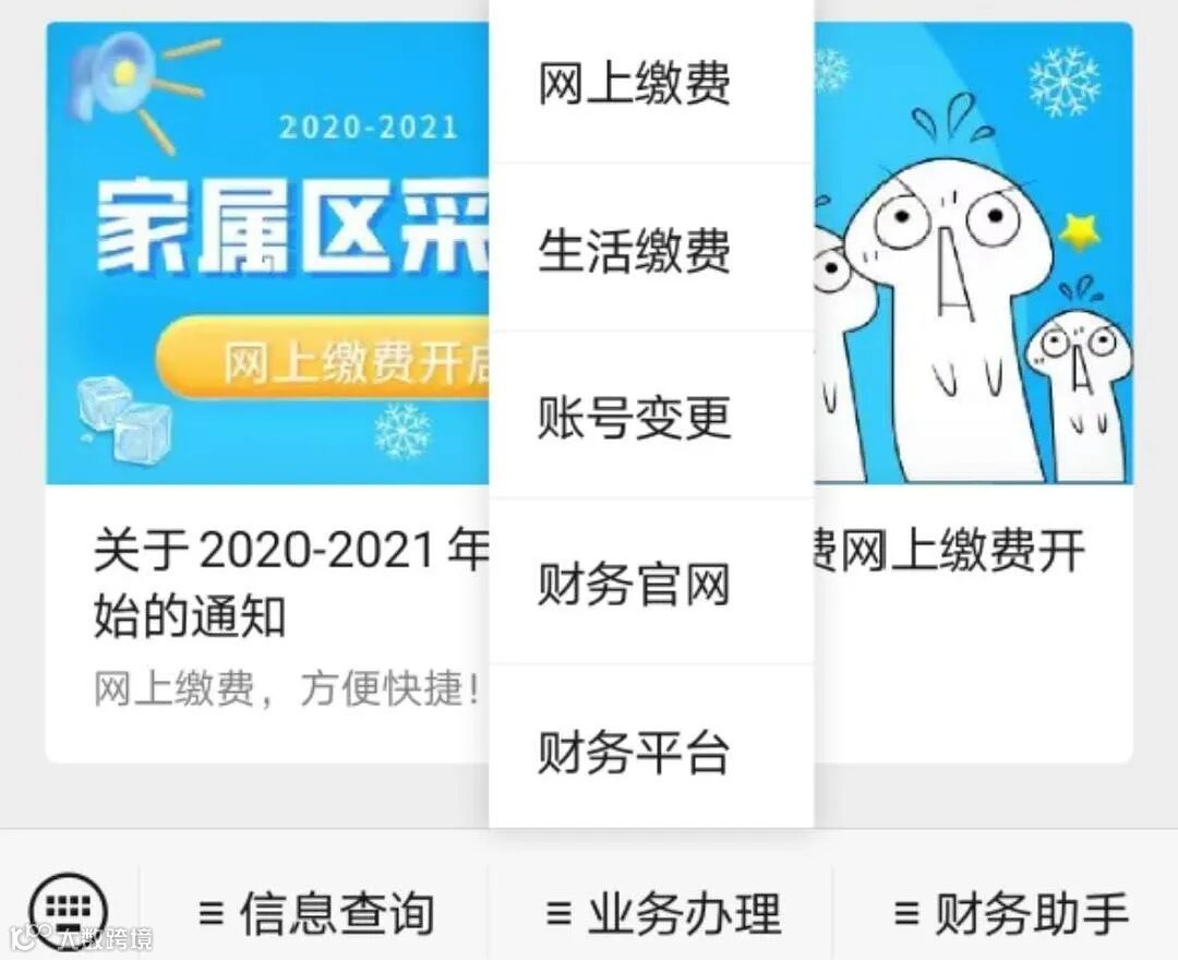微信里搜索公众号“北京科技大学财务处”,或者长按文末图片识别二维码,关注财务公众号。进入菜单“业务办理”-“生活缴费”。(如下图示)