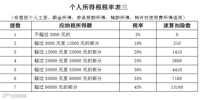非居民个人工资、薪金所得,劳务报酬所得,稿酬所得,特许权使用费所得应纳税额=应纳税所得额×税率-速算扣除数